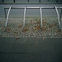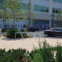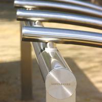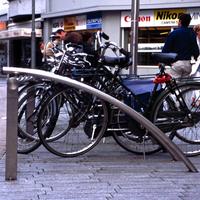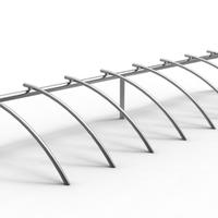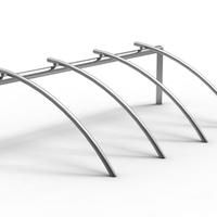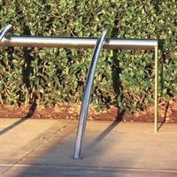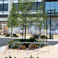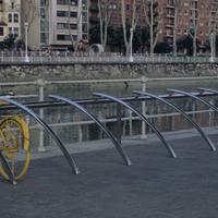 Los brazos curvados del soporte para bicicletas Bicilinea, de diseño atractivo y elegantemente fabricados en acero inoxidable - diseñados por Beth Galí, los brazos curvados están montados sobre una barra rectilínea para proporcionar un fuerte soporte y un acceso intuitivo para varias bicicletas.